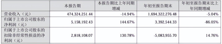 根据宜通世纪2025年前三季度报告显示,1-9月公司总营收为16.94亿元,同比下降5.04%;归母净利润为339.3万元,同比下降86.05%;扣非净利润-508.4万元,同比增长14.76%。